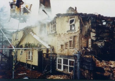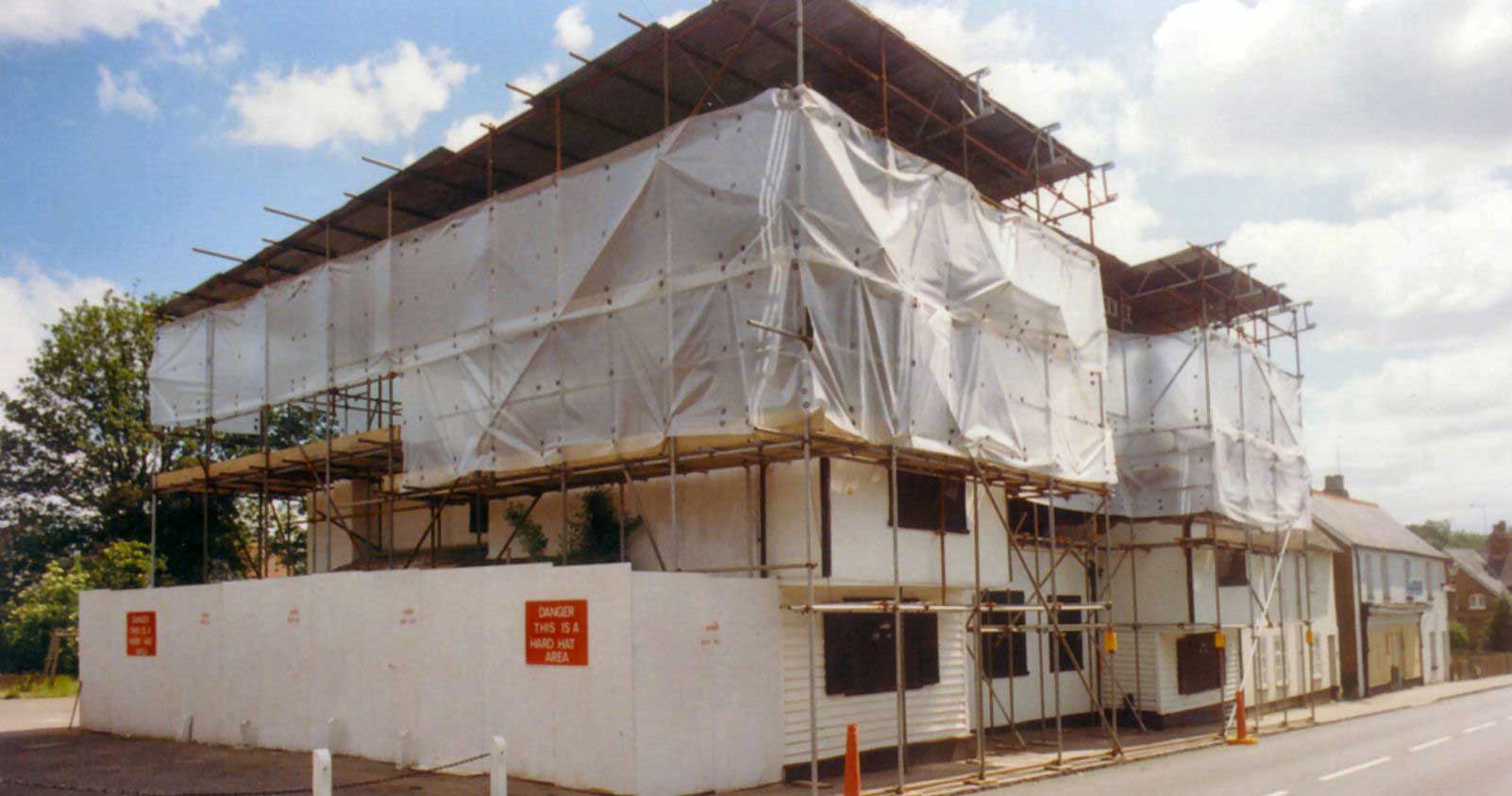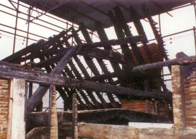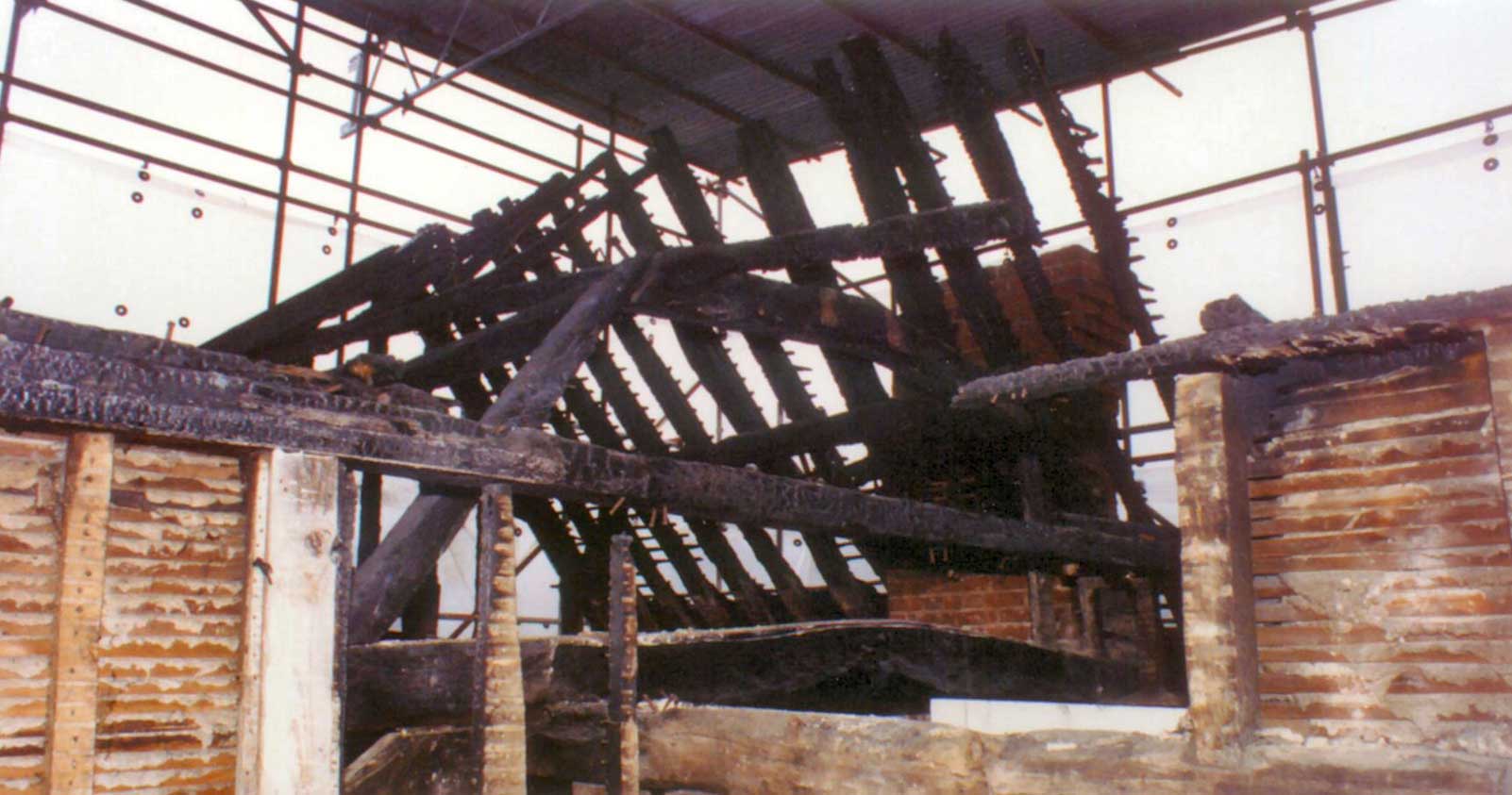The pub caught fire and was burnt out to just above first floor level. The pub was restored using oak framings matching the original details as far as possible. To carry out the restoration David French Partnership sifted through the ashes to locate parts of the original structural frame to identify how connections were made and then to reproduce the original connections as far as possible.