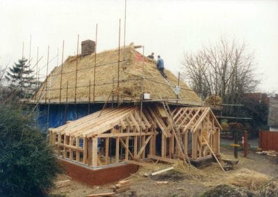 The restoration used a mixture of traditional softwood timber and oak framings. By careful investigation of the burnt trusses the construction details were reproduced as closely as possible.